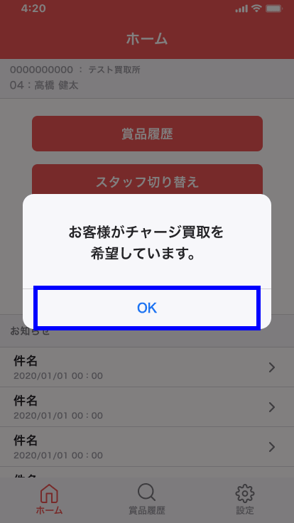 1.お客様がチャージ買取を希望する通知が来ますので、[OK]をタップします。