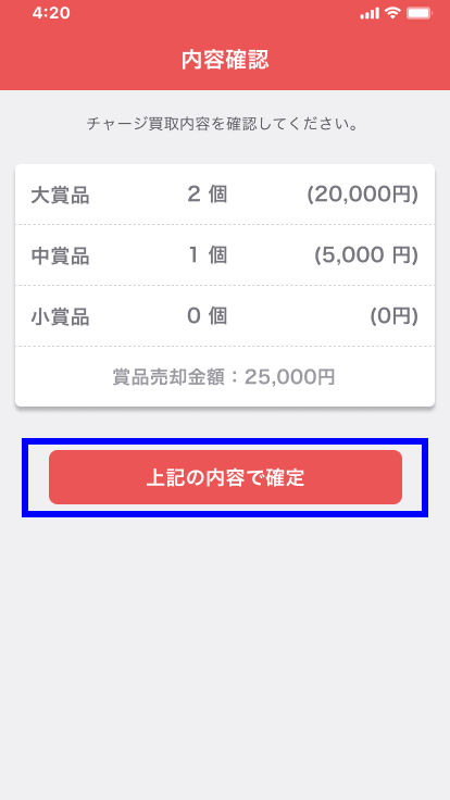 3.チャージ買取内容を確認し、[上記の内容で確定]をタップします。