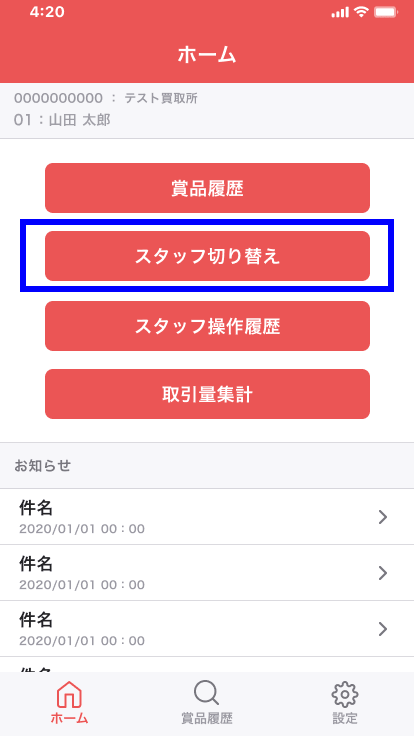 1.ホーム画面から[スタッフ切り替え]をタップします。
