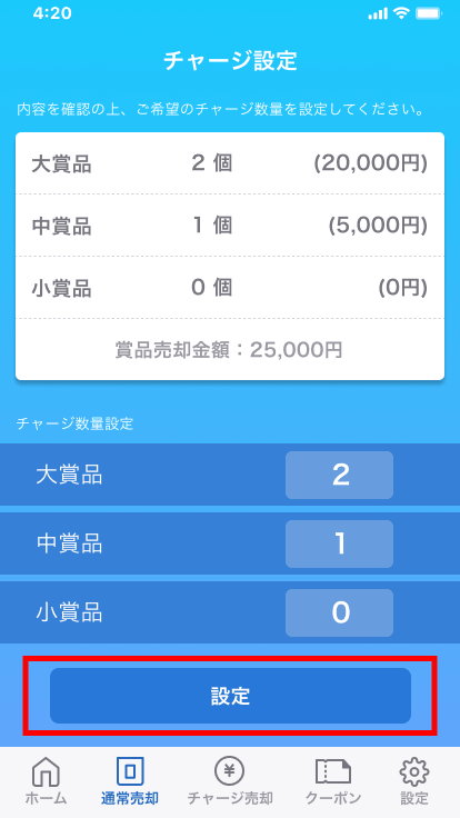 4.賞品の数を確認し、[設定]をタップします。