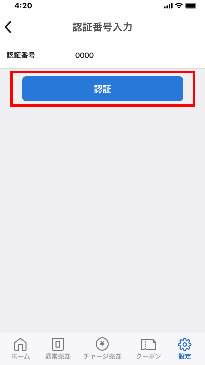 - 4.登録した電話番号に送られてくるSMSに記載されている認証番号を入力して[認証]をタップします。